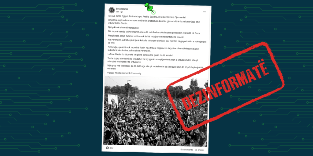 Nëpërmjet një imazhi të publikuar në Facebook pretendohet të paraqitet një protestë e mbajtur në Berlin – Gjermani, në përkrahje të Palestinës.