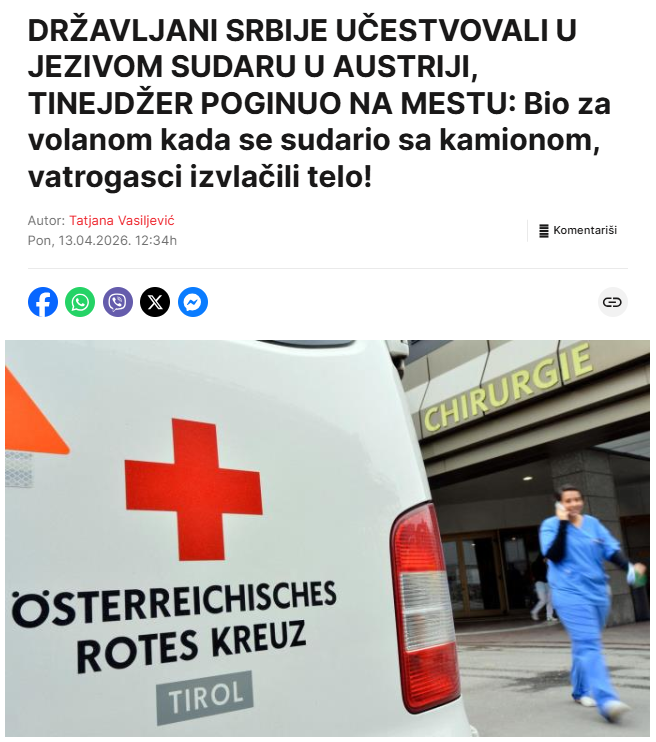 “Kurir.rs” në artikullin e publikuar të hënën më 13 prill, ka raportuar me titullin “SHTETAS TË SERBISË PËRFSHIHEN NË NJË PËRPLASJE TË TMERRSHME NË AUSTRI, ADOLOSHENTI VDIQ NË VEND: Ishte pas timonit kur u përplas me një kamion, zjarrfikësit nxorën trupin!”.