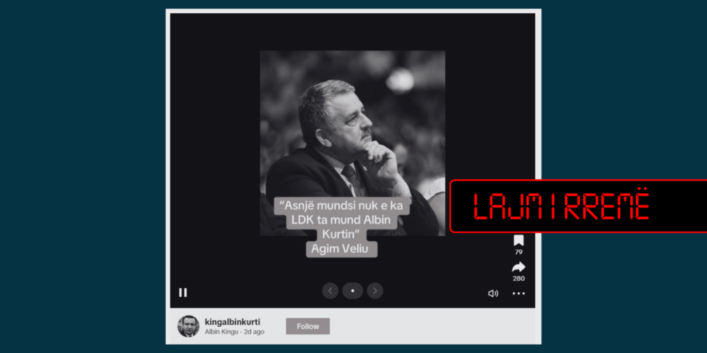 Është publikuar një imazh me mbishkrimin që pretendon se Agim Veliu, deputet i Kuvendit të Kosovës ka deklaruar se Lidhja Demokratike e Kosovës (LDK) nuk e ka asnjë mundësi ta mund Albin Kurtin.