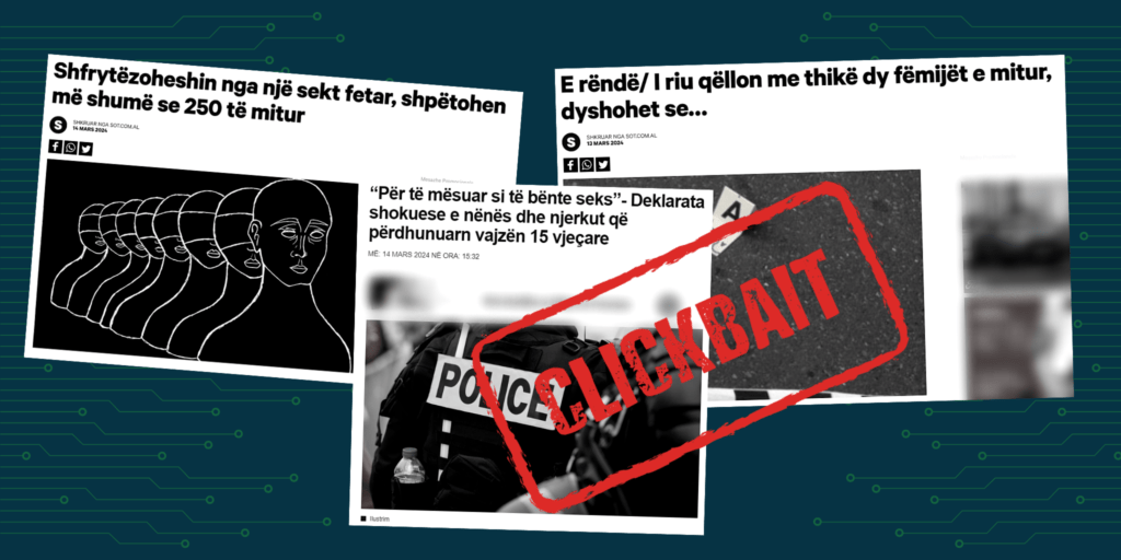 “Clickbait” vlerësohen ato përmbajtje informative titulli i të cilave është përgjithësues dhe nuk bënë të ditur vendndodhjen e ngjarjes, kontekstin dhe relevancën. Tekste dhe artikuj të tillë synojnë të tërheqin vëmendjen e audiencës me tituj sensacionalë me pasojë çorientuese, që nuk e qartësojnë saktësisht përmbajtjen e artikullit. Titujt “clickbait” bëhen kryesisht për të tërhequr lexueshmëri në rastin e publikimeve mediatike dhe/ose për të fituar nga klikimet në rastet e publikimeve komerciale.