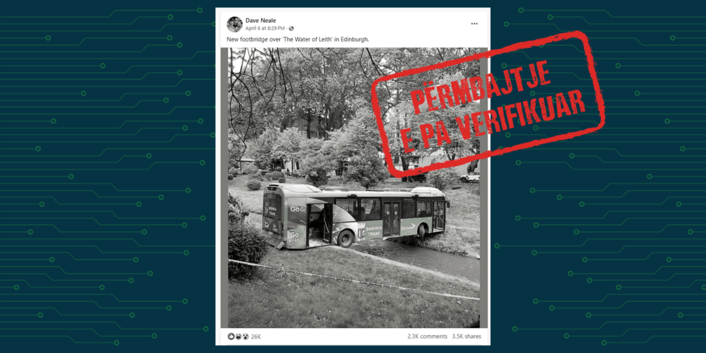 Në një grup në Facebook me përmbajtje në gjuhën angleze “Travel Scotland Goals Group” është publikuar me datë 6 prill një fotografi që shfaq një autobus mbi një pjesë të lumit, e cila mban mbishkrimin “New footbridge over ‘The Water of Leith’ in Edinburgh”, që në shqip përkthehet “Urë e re për këmbësorë mbi ‘The Water of Leith’ në Edinburg”.