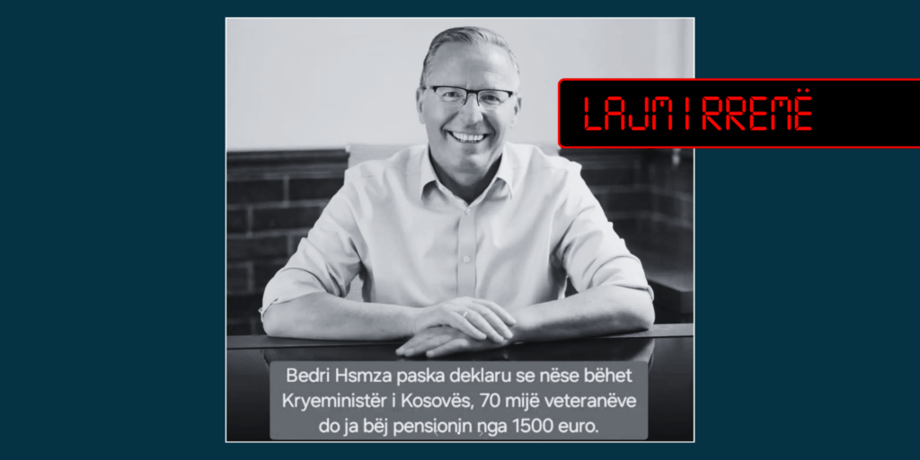 Është publikuar një përmbajtje ku pretendohet se kandidati i Partisë Demokratike të Kosovës (PDK) për kryeministër, Bedri Hamza është deklaruar se në rast të marrjes së këtij posti, do t’i rritë pensionet për veteranët e luftës deri në 1500 euro.