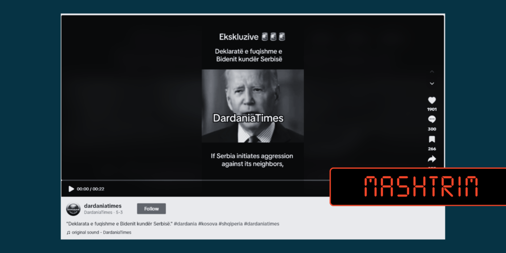 Nëpërmjet një video-materiali, u pretendua se Joe Biden është deklaruar se “Nëse Serbia nis agresionin kundër fqinjëve të saj, Kosovës ose Bosnjës, SHBA-të nuk do të hezitojnë të përdorin të gjithë forcën e nevojshme në përgjigje”.
