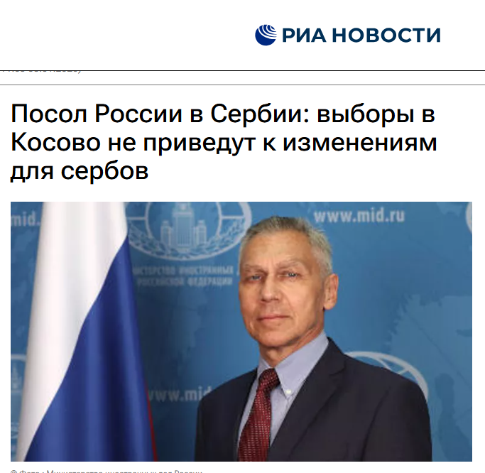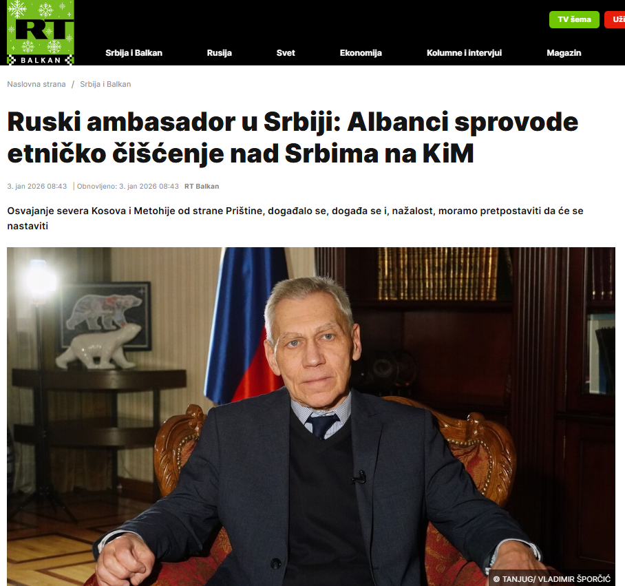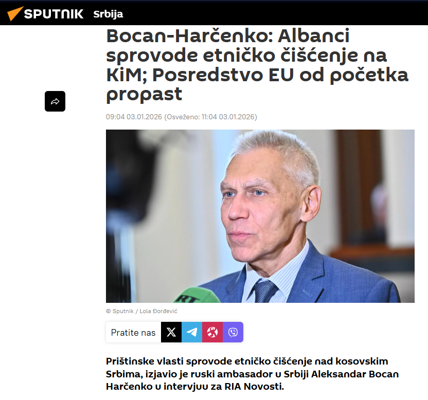 Në një intervistë për agjencinë shtetërore ruse të lajmeve RIA Novosti, ambasadori i Rusisë në Serbi, Aleksandar Bocan-Kharçenko, ka bërë një sërë pretendimesh të pa mbështetura në fakte ndaj autoriteteve të Kosovës dhe situatës së serbëve në vend.
