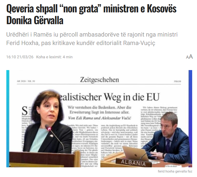 Mediumi në gjuhën shqipe, “Lapsi.al”, të shtunën (21 mars) raportoi se ministri i Jashtëm i Shqipërisë, Ferit Hoxha, është urdhëruar nga Edi Rama, kryeministri shqiptar, që të pamundësojë çdo vizitë zyrtare në Shqipëri, për Donika Gërvallën, ministren aktuale të Drejtësisë në Kosovë (shih këtu).