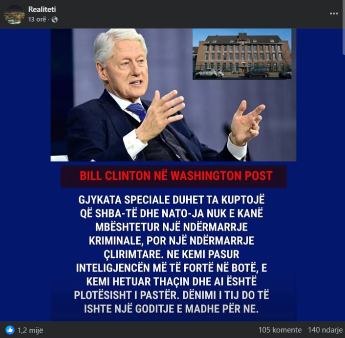 Është publikuar një imazh i Bill Clinton, i shoqëruar me një mbishkrim që pretendon se ai ka deklaruar se Hashim Thaçi është “plotësisht i pastër” dhe se një dënim i tij do të ishte “goditje e madhe për SHBA-në”. Postimi gjithashtu pretendon se kjo deklaratë është bërë për mediumin The Washington Post.