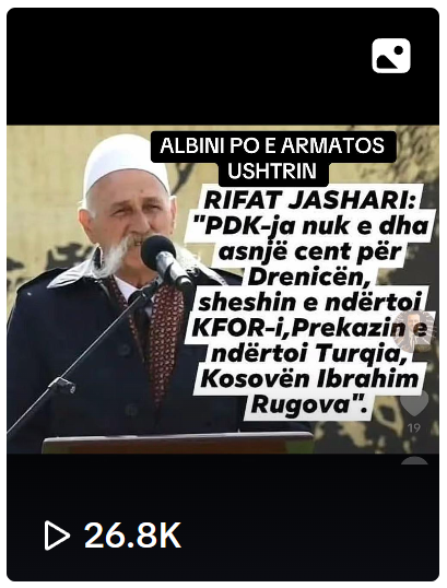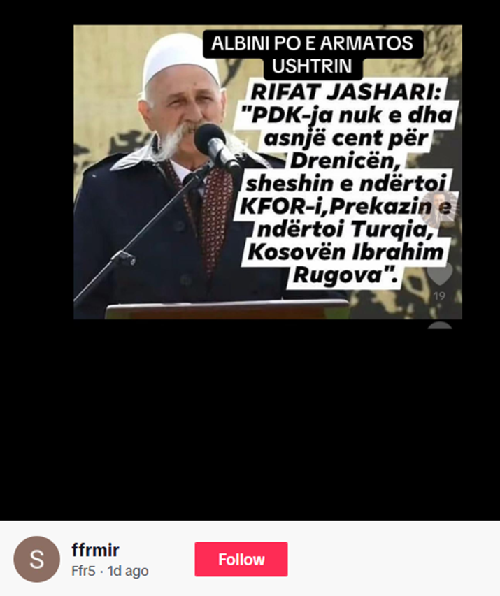 Publikohet një imazh ku shfaqet Rifat Jashari, vëllai i Adem Jasharit, komandantit dhe themeluesit të Ushtrisë Çlirimtare të Kosovës (UÇK), me mbishkrimin që pretendon se ai ka deklaruar se “PDK-ja (Partia Demokratike e Kosovës) nuk e dha asnjë cent për Drenicën, sheshin e ndërtoi KFOR-i, Prekazin e ndërtoi Turqia, ndërsa Kosovën Ibrahim Rugova”.
