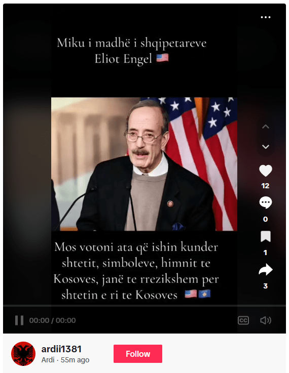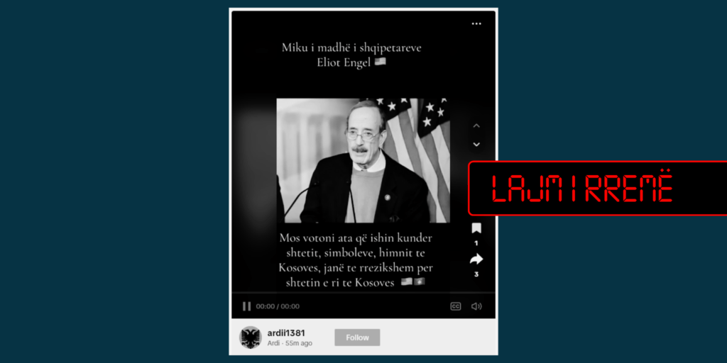 Publikohet nje imazh me figurën e Eliot Engelit, ish-kongresist amerikan, në mbishkrimin e së cilës pretendohet se ai ka deklaruar që të mos votohet për ata që ishin kundër simboleve dhe himnit Të Kosovës, pasi që ata janë të rrezikshëm për shtetin e ri të Kosovës.