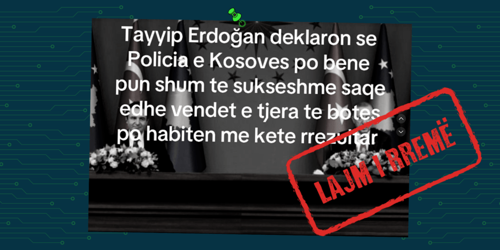 Imazhit të presidentit turk i është vendosur mbishkrimi, që pretendon se ky i fundit ka dhënë vlerësime të larta për Policinë e Kosovës dhe ka deklaruar se Turqia do ta furnizojë me pajisje këtë institucion.