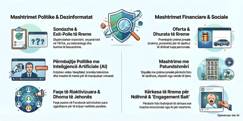 Gjatë vitit 2025, peizazhi informativ në Kosovë u karakterizua nga një rritje e sofistikuar e dezinformimit, e nxitur veçanërisht nga zgjedhjet parlamentare dhe ato lokale. Përdorimi i metodave të reja teknologjike dhe riaktivizimi i taktikave të vjetra krijuan mjedis kompleks sfidues për audiencën. Më poshtë janë detajuar gjashtë fenomenet kryesore