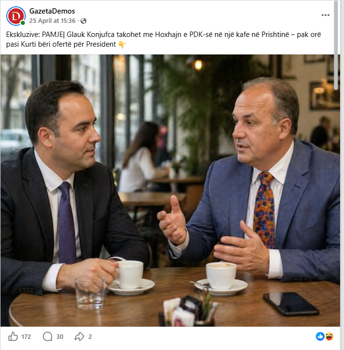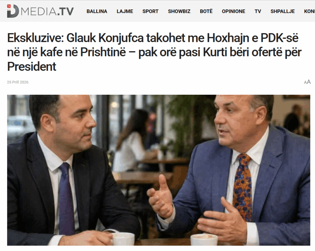 Më 25 prill, gazeta Demos publikoi një artikull me titull: “Ekskluzive: PAMJE | Glauk Konjufca takohet me Hoxhajn e PDK-së në një kafe në Prishtinë, pak orë pasi Kurti bëri ofertë për President”.