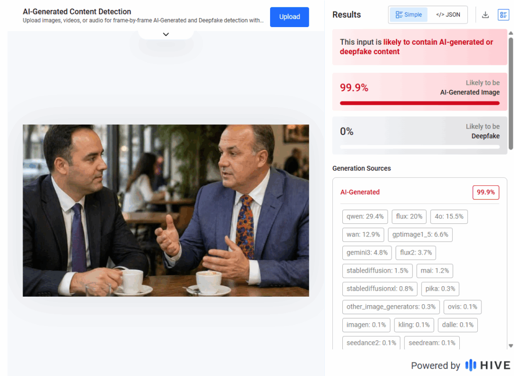 Po ashtu, mjetet për verifikimin e përmbajtjeve të gjeneruara me inteligjencë artificiale si “Hivemoderation”, sugjerojnë se fotografia e përdorur në ballinë është krijuar 100% me IA. Elementet vizuale të saj përputhen me karakteristikat tipike të imazheve të sintetizuara, përfshirë detaje jo natyrale dhe strukturë të përgjithshme të gjeneruar.