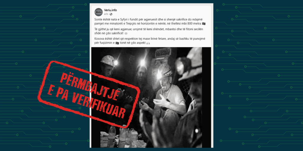 Në bazë të kontrollit të fakteve, hibrid.info ka vërtetuar se portali “Veriu.info” ka publikuar në Facebook një fotografi të minatorëve në Bosnje e Hercegovinë, me pretendimin se në të paraqiten minatorët e Trepçës gjatë ngrënies së syfyrit në një thellësi mbi 800 metra.