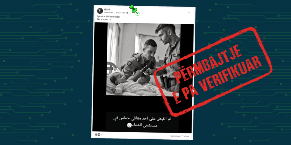 Nëpërmjet një fotografie ku shihen dy ushtarë duke i drejtuar revolen një foshnje pretendohet se paraqitet si situatë aktuale në një spital në Gaza.