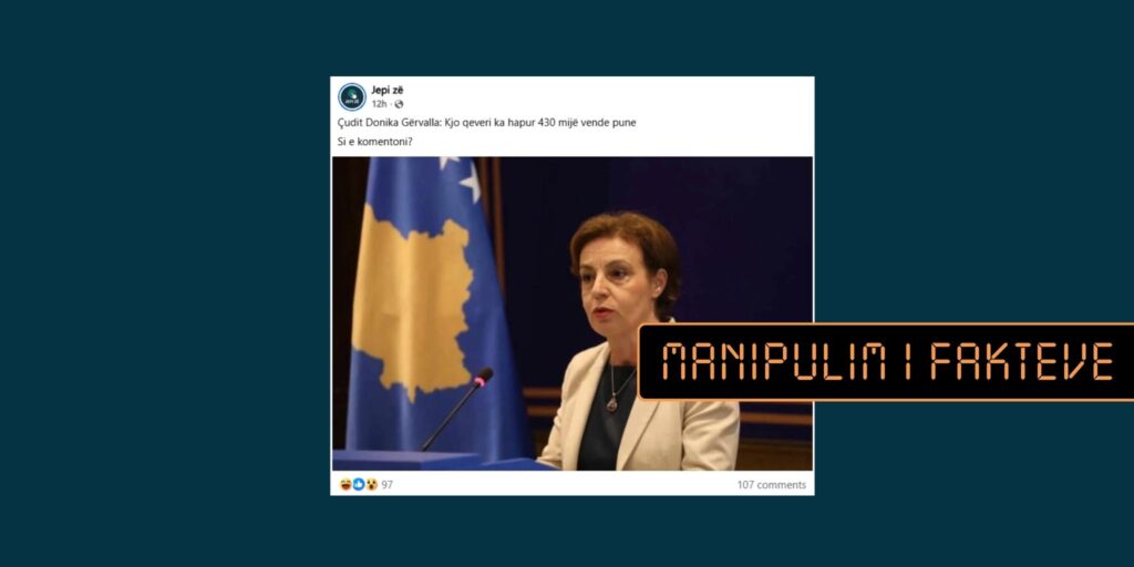 Publikohen përmbajtje me mbishkrimin që pretendon se Donika Gërvalla, zëvendëskryeministrja dhe ministrja në detyrë e Punëve të Jashtme, ka deklaruar se “Kjo qeveri i ka hapur 430 mijë vende të reja pune.”