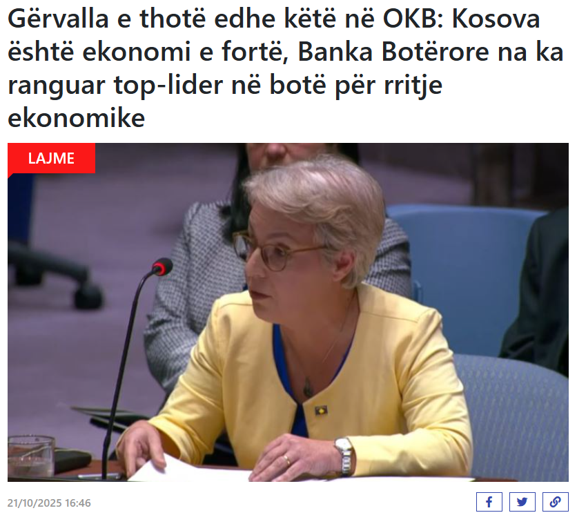 Publikohen artikuj me titullin “Gërvalla në OKB: Kosova është ekonomi e fortë, Banka Botërore na ka ranguar top-lider në botë për rritje ekonomike”.