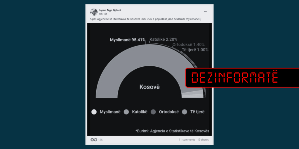 “Sipas Agjencisë së Statistikave të Kosoves, mbi 95% e popullsisë janë deklaruar myslimanë”, mban mbishkrimin një grafikë e publikuar dje (22 shtator).