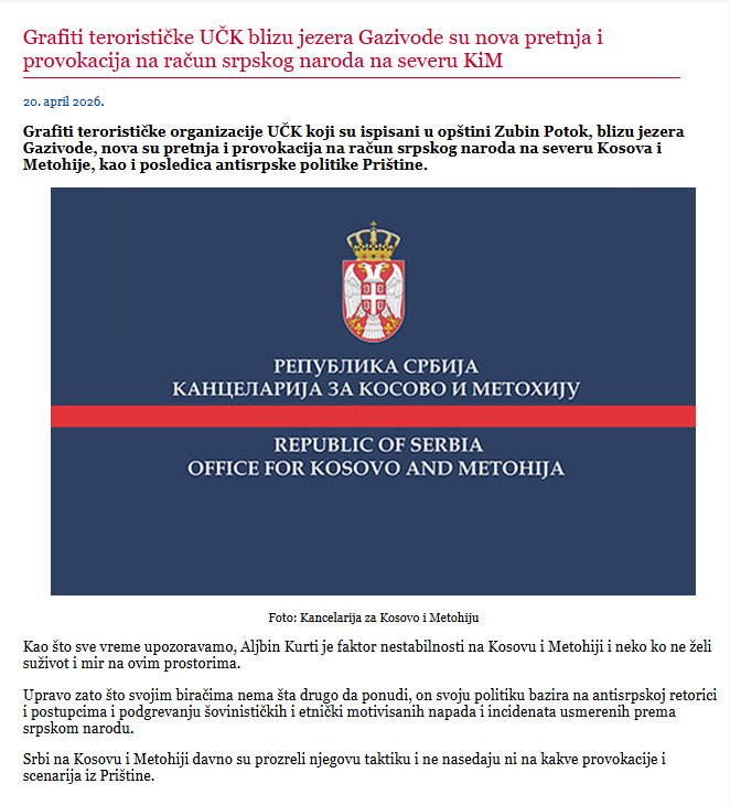 Ky pretendim është publikuar më 20 prill 2026 nga disa media në gjuhën serbe, përfshirë Newsmax Balkans, Vaseljenska, RTV dhe RTS, të cilat raportuan për grafite me mbishkrimin “UÇK” të shkruara në rrugën pranë Liqenit të Ujmanit, në komunën e Zubin Potokut.