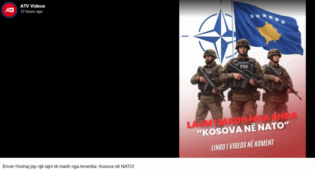 Përmbajtja është publikuar në Facebook në njërën nga faqet e televizionit “ATV”, që ka emrin “ATV Videos” dhe ka mbishkrimin “Enver Hoxhaj jep një lajm të madh nga Amerika: Kosova në NATO!”.