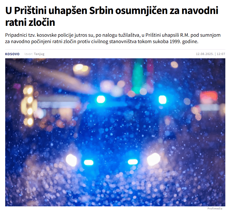 Më 12 gusht, portalet serbe “B92.net” dhe “Objektiv.rs” raportuan se në Prishtinë ishte arrestuar një serb i dyshuar për krime lufte.