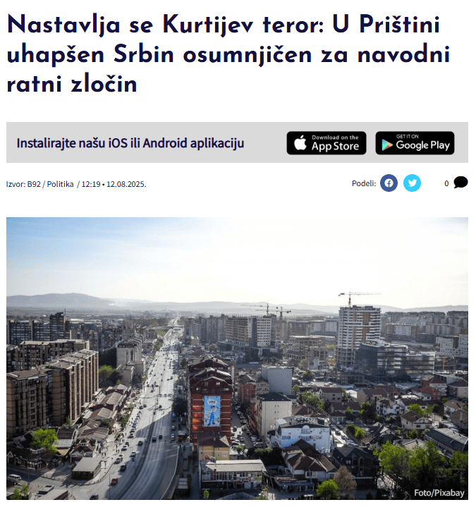 Në disa media në gjuhën serbe, të martën (12 gusht) u publikuan artikuj me pretendimin se në Prishtinë u arrestua një serb i dyshuar për krime lufte.
