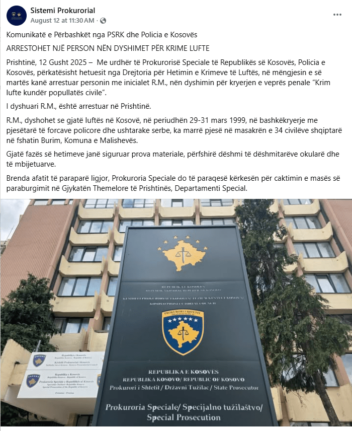 Pas hulumtimit online, u gjet se bëhet fjalë për personin me incialet R.M., i cili të martën (12 gusht) u arrestua nga Policia e Kosovës nën dyshimin për kryerjen e veprës penale “Krim lufte kundër popullatës civile”. (shih këtu njoftimin e Prokurosisë Speciale)