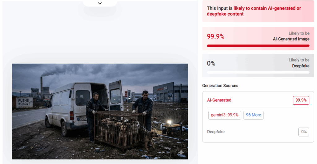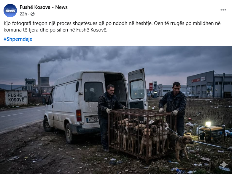 Përmes një imazhi që pretendohet se paraqet transportimin e qenve endacakë në Fushë Kosovë, rezulton të mos jetë autentik. Verifikimi i fakteve vërtetoi se imazhi është i gjeneruar përmes inteligjencës artificiale.