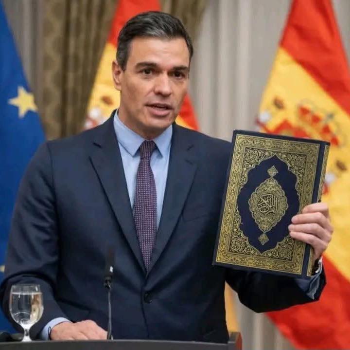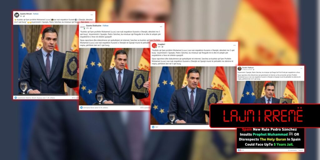 Në rrjetet sociale është shpërndarë një imazh i Pedro Sánchez me Kuran në dorë, duke pretenduar se në Spanjë është miratuar një rregull i ri sipas të cilit kushdo që fyen Profetin Muhamed ose nuk respekton Kuranin dënohet me deri në 5 vjet burg.