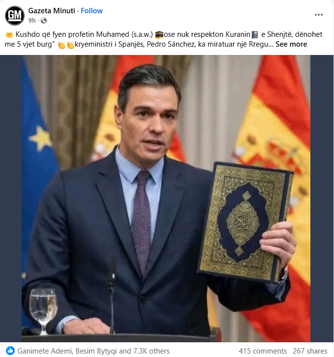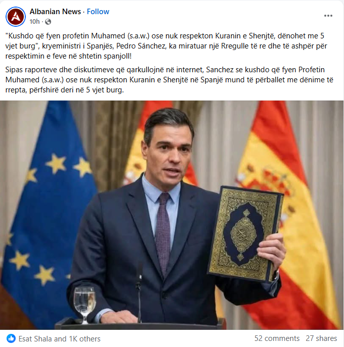 Disa faqe në Facebook në gjuhën shqipe kanë publikuar një imazh të Pedro Sánchez, në të cilin ai paraqitet duke mbajtur librin e shenjtë të Islamit, Kuranin. Ky imazh është shpërndarë me pretendimin se: “Kushdo që fyen profetin Muhamed (s.a.w.) ose nuk respekton Kuranin e Shenjtë dënohet me 5 vjet burg. Kryeministri i Spanjës, Pedro Sánchez, ka miratuar një rregull të ri dhe të ashpër për respektimin e feve në shtetin spanjoll”. (këtu, këtu, këtu, këtu, këtu)