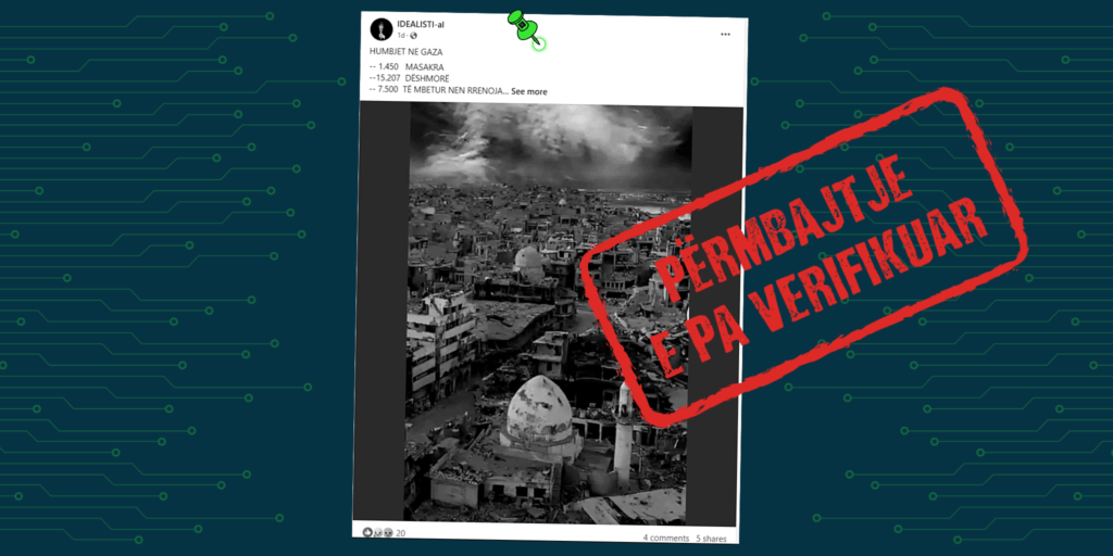 Pas verifikimit të fakteve të kryer nga hibrid.info, është vërtetuar se faqja në Facebook “IDEALISTI-al” ka publikuar një fotografi të vitit 2017 të qytetit Mosul në Irak, me pretendimin se pamjet paraqesin qytetin e shkatërruar të Gaza-s.