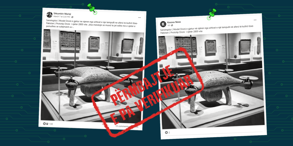 Llogaria në Facebook me emër “Shkumbin Muriqi” si dhe faqja “Kosova Neës” kanë publikuar (7 dhe 9 mars) një imazh me mbishkrimin “Sanxingdui ( Model Droni e gjetur ne njeren nga arhivat e nje tempulli ne afersi te kufirit Kine- Pakistan ) Prototip Droni  i vjeter 2800 vite”.