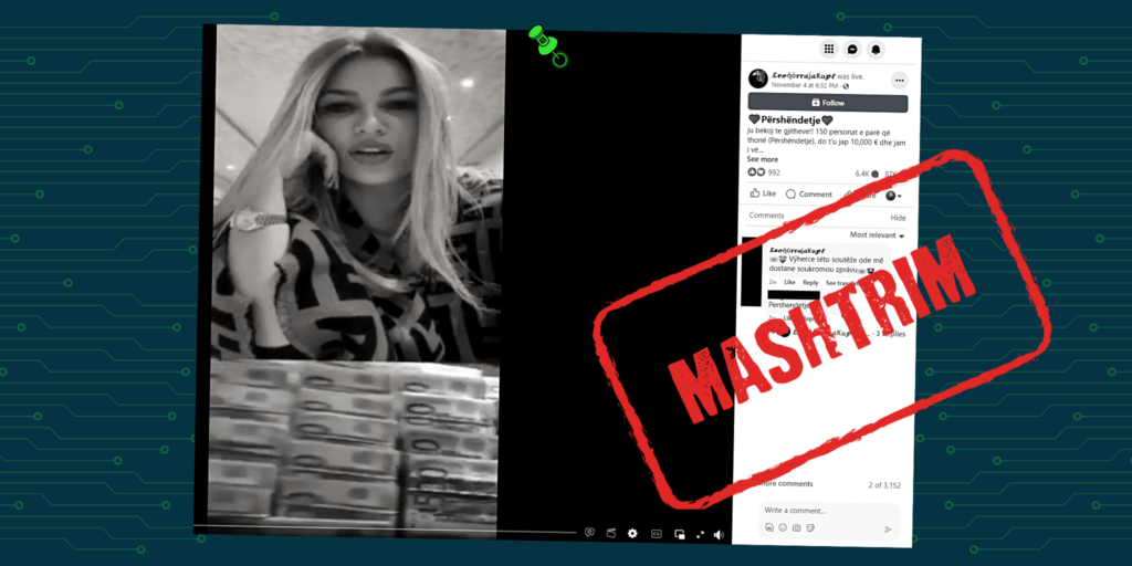 Në përshkrimin e këtij materiali shkruan “Përshëndetje ju bekoj te gjitheve!! 150 personat e parë që thonë (Përshëndetje), do t’u jap 10,000 € dhe jam i vërtetë, Që tani e tutje”.