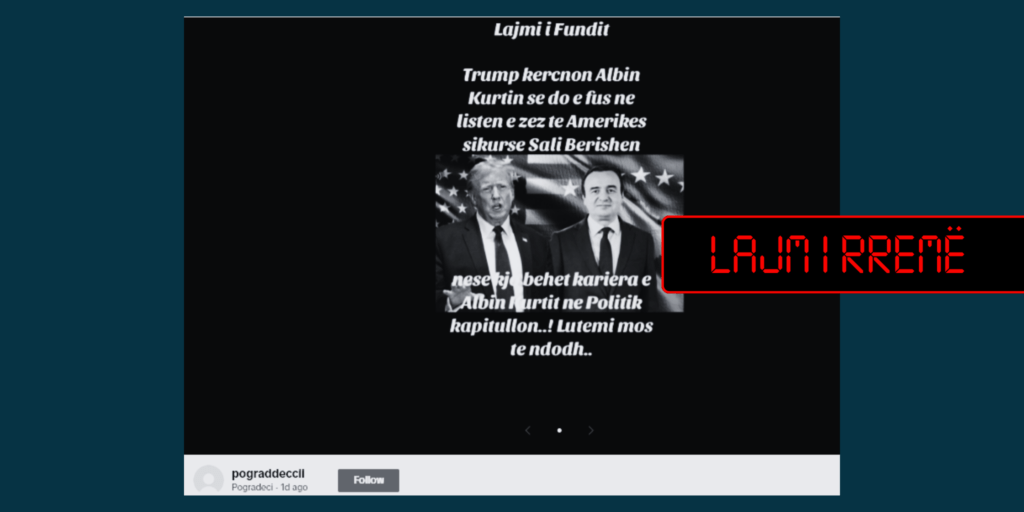 Është publikuar një imazh, me mbishkrimin që pretendon se Donald Trump, kandidati për president në Shtetet e Bashkuara të Amerikës (SHBA), ka kërcënuar se Albin Kurti, kryeministri i Kosovës, do të jetë pjesë e listës së zezë së SHBA-së.