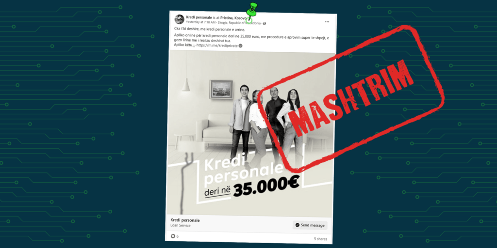 Faqja në Facebook që mban emrin “Kredi personale” ka publikuar më datë 18 dhjetor një postim në të cilin pretendohet se ofrohet mundësi për kredi personale deri në 35 mijë euro.