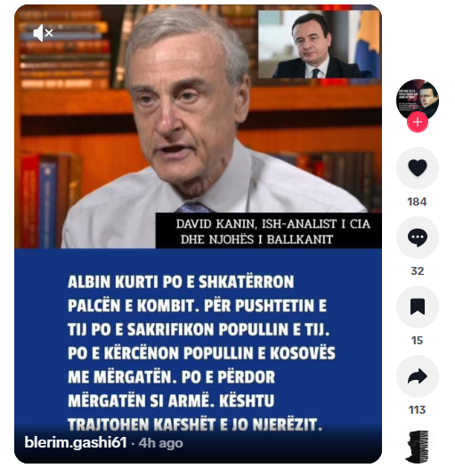 Pas verifikimit të fakteve, del se Kanin nuk ka dhënë deklaratë të tillë. Nëpërmjet një postimi në TikTok është pretenduar për një deklaratë për kryeministrin në detyrë të Kosovës, Albin Kurti, dhënë nga David Kanin, njohës amerikan i çështjeve të Ballkanit dhe ish-analist i lartë i CIA-s për rajonin dhe Evropën.