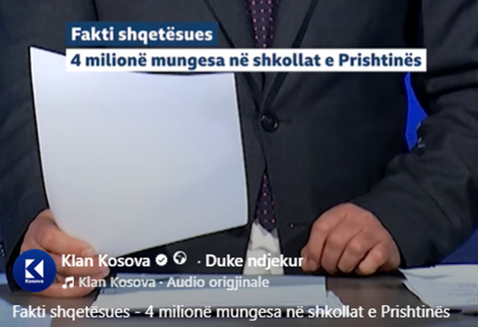 Mediumi “Koha.net” ka paraqitur pretendimin me anë të një artikulli, ndërsa “Klan Kosova” nëpërmjet një storje të lexuar në një edicion lajmesh. Pas kontrollit të përmbajtjeve u vërejt se në storjen e “Klan Kosova”, pretendimi i paraqitur në titull, dallon me atë të cilin e lexon moderatori i lajmeve, për shkak se ai gjatë leximit e thekson së bëhët fjalë për katër milionë mungesa në shkollat e Kosovës.