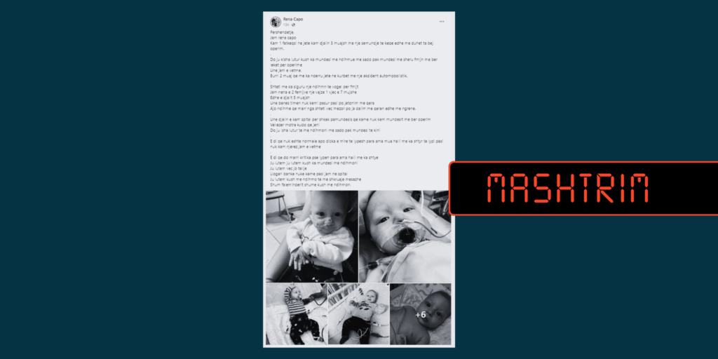 Është publikuar një përmbajtje në gjuhën shqipe, ku kërkohet ndihmë financiare për një foshnje 5 muajsh të sëmurë, e cila ka nevojë për operim.