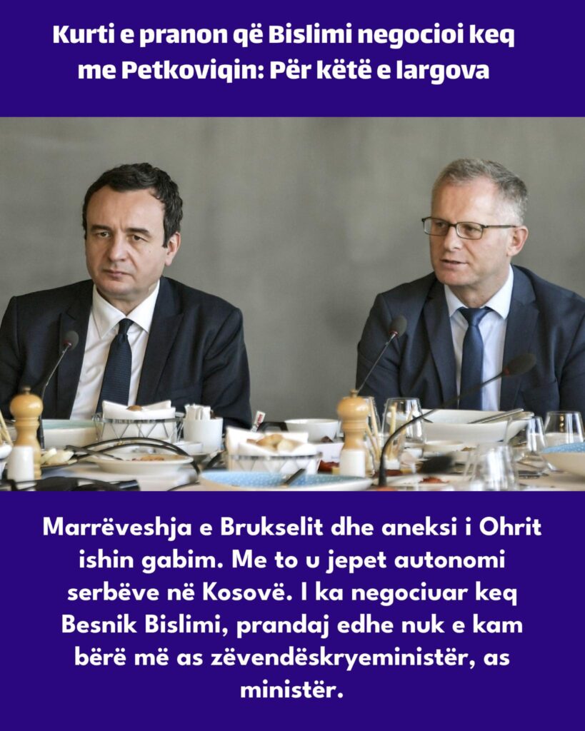 Imazhi ka mbishkrimin ku shkruan “Kurti e pranon qē Bislimi negocioi keq me Petkoviqin: Pēr kētē e largova. Marrēveshja e Brukselit dhe aneksi i Ohrit ishin gabim. Me to u jepet autonomi serbēve nē Kosovē. I ka negociuar keq Besnik Bislimi, prandaj edhe nuk e kam bērē mē as zēvendēskryeministēr, as minister.