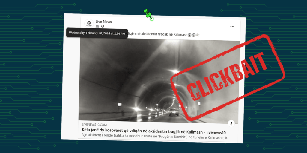 Duke publikuar një artikull të tetorit të vitit të kaluar lidhur me vdekjen e dy personave me shtetësi kosovare në aksidentin në rrugën e Kombit, në tunelin e Kalimashit , faqja “Live News” në Facebook është munduar ta paraqes rrejshëm këtë si ngjarje aktuale.