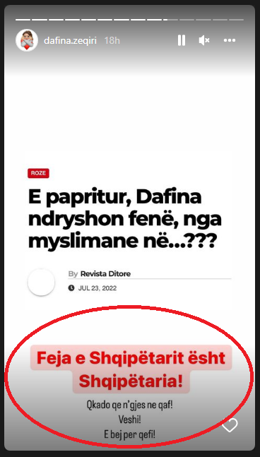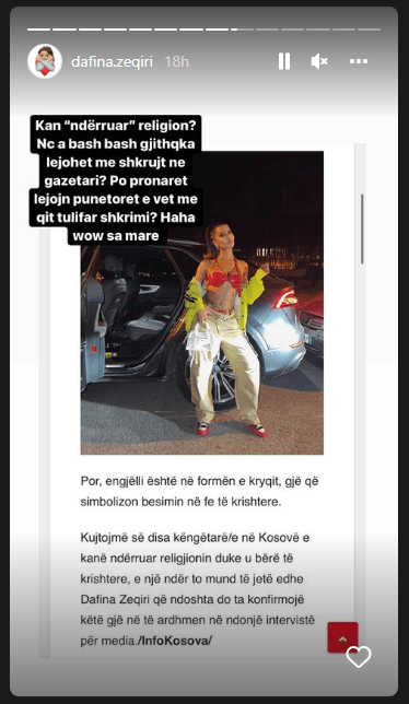 Dafina Zeqiri ka reaguar në profilin e saj në Instagram ndaj këtij pretendimi. Ajo ka lënë të kuptohet se publikimet në media janë të rreme, përmes pakënaqësisë së shprehur në postimet e saj, ndaj mediave. Gjithashtu, në njërin nga “Story”-t  në profilin e saj në Instagram ka vendosur thënien se “feja e shqiptarit është shqiptaria”, duke e lënë të kuptohet se qaforja nuk përfaqëson bindjen e saj fetare. (shih fotografitë më poshtë)