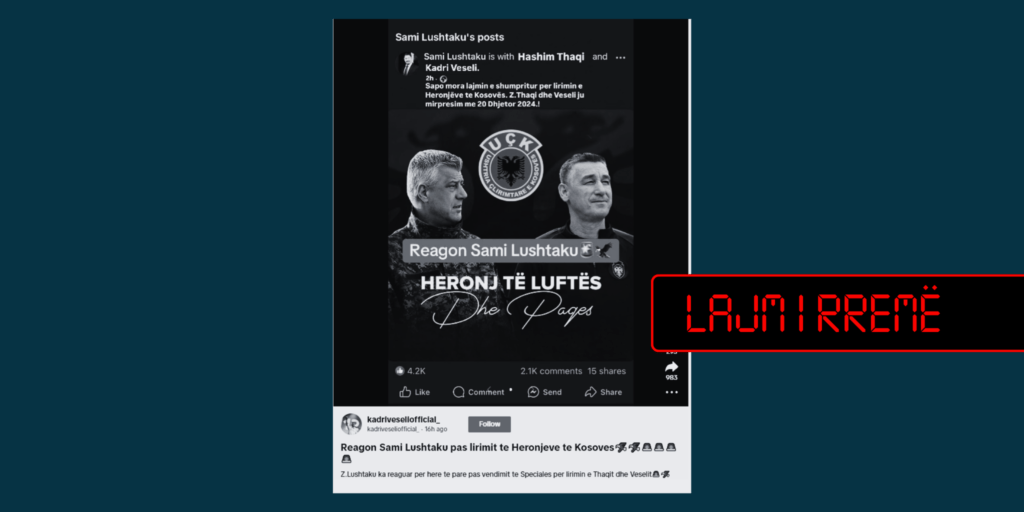 Përmes një postimi pretendohet se anëtari i Këshillit Drejtues të Partisë Demokratike të Kosovës (PDK), Sami Lushtaku, ka shkruar në faqen e tij zyrtare në Facebook se Hashim Thaçi dhe Kadri Veseli do të lirohen më 20 dhjetor nga Gjykata Speciale.