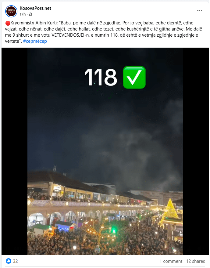 “Kryeministri Albin Kurti: “Baba, po me dalë në zgjedhje. Por jo veç baba, edhe djemtë, edhe vajzat, edhe nënat, edhe dajët, edhe hallat, edhe tezet, edhe kushërinjtë e të gjitha anëve. Me dalë me 9 shkurt e me votu VETËVENDOSJE!-n, e numrin 118, që është e vetmja zgjidhje e zgjedhje e vërtetë”. #cepmëcep” është përshkrimi i vendosur nga faqja në Facebook, “KosovaPost.net”. Kjo ishte pjesë e deklaratës që dëgjohet nga Kurti.