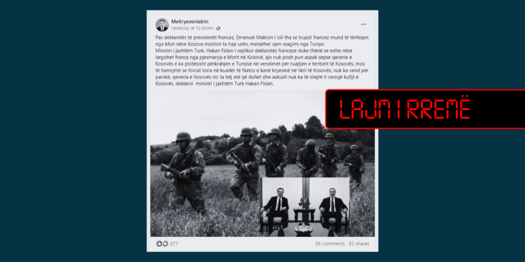 Po ashtu, në postimin e bërë në Facebook nga faqja “MeKryeministrin”, u pretendua se gjoja për këtë deklaratë të Macronit, ka reaguar ministri i Jashtëm turk Hakan Fidan.