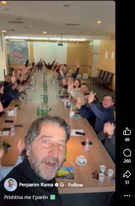 Është publikuar një imazh i cili paraqet kryetarin e Prishtinës, Përparim Rama, në një tavolinë përplot ushqim, e dhjetëra njerëz të ulur përreth saj. Sipas imazhit, kryetari Rama është duke shkrepur ‘selfie’ ndërsa personat në fotografi kanë ngritur duart lartë.