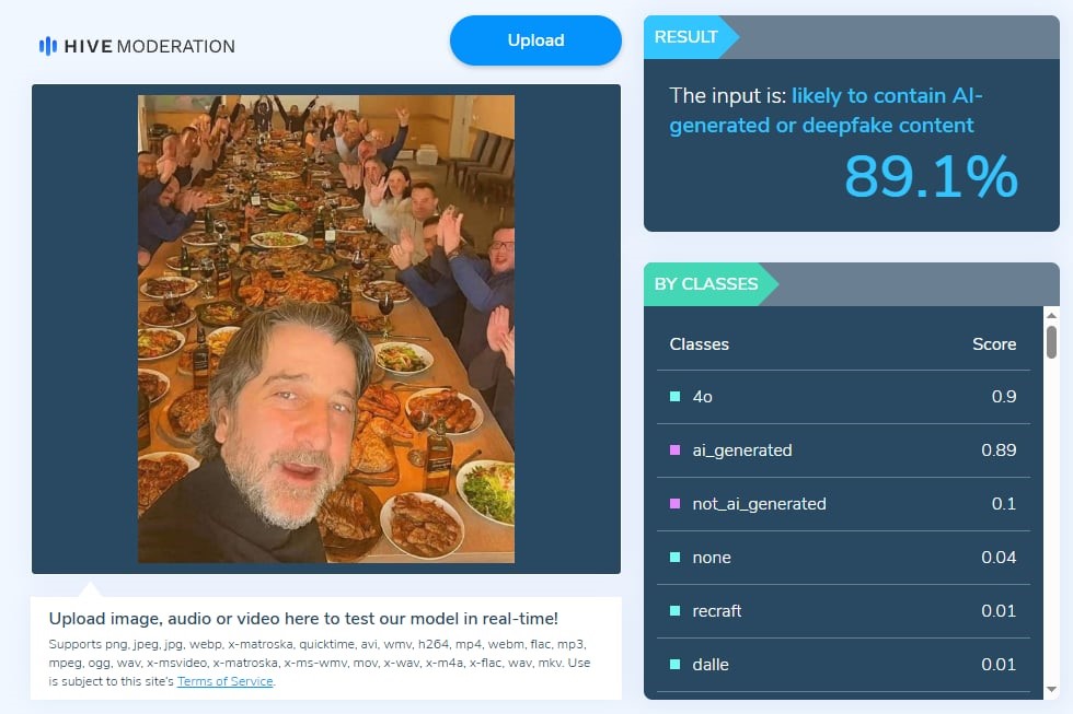Për më shumë, hibrid.info ka verifikuar përmbajtjen në platformën për verifikim të përmbajtjeve të gjeneruara me inteligjencë artificiale “Hivemoderation”, dhe ka rezultuar se imazhi është krijuar nën asistimin e inteligjencës artificiale.
