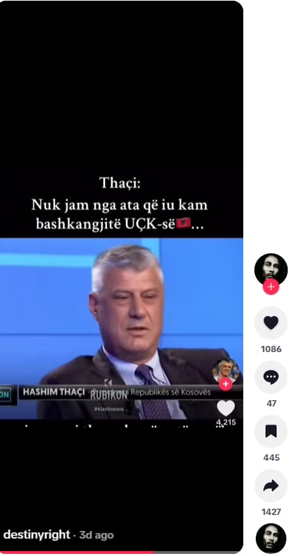Nëpërmjet një videoje të publikuar në TikTok është pretenduar se ish-presidenti i Kosovës, Hashim Thaçi, ka deklaruar se nuk është nga ata që i janë bashkëngjitur Ushtrisë Çlirimtare të Kosovës.