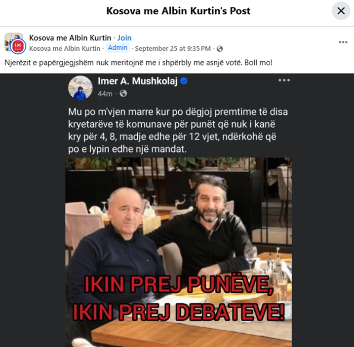 Në grupin me emrin “Kosova me Albin Kurtin” në Facebook, llogaria me të njëjtin emër ka pretenduar se opinionisti Imer Mushkolaj ka publikuar fotografinë e kryetarëve të Prishtinës dhe Pejës, shoqëruar me një kritikë për premtimet e disa kryetarëve që, sipas tij, nuk i kanë kryer punët në mandatet e tyre e tash kërkojnë edhe një mandat.