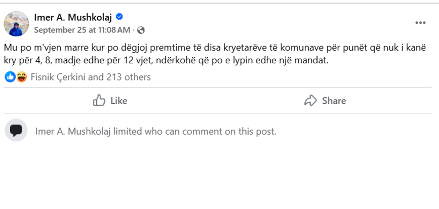 “Mu po m’vjen marre kur po dëgjoj premtime të disa kryetarëve të komunave për punët që nuk i kanë kry për 4, 8, madje edhe për 12 vjet, ndërkohë që po e lypin edhe një mandat”, është shkrimi i Mushkolajt në Facebook më 25 shtator.