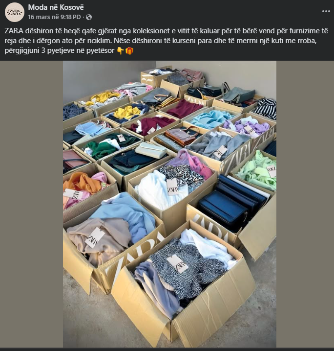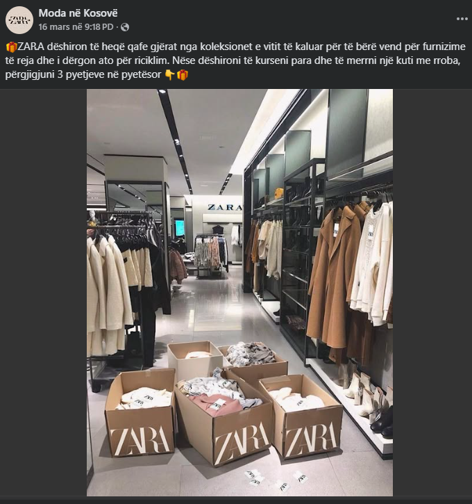 Janë publikuar dy përmbajtje ku pretendohet se ZARA, kompania e modës po largon rrobat nga koleksionet e vitit të kaluar për t’i “ricikluar” dhe se përdoruesit mund të përfitojnë një kuti me rroba falas ose me çmim të ulët. E gjitha kjo mund të ndodhë duke plotësuar një pyetësor me 3 pyetje.