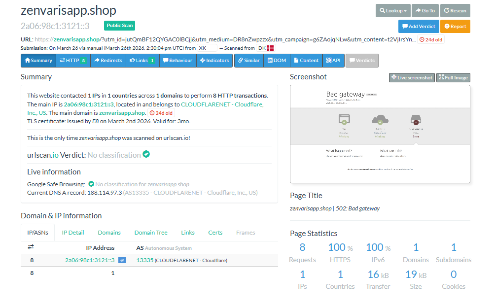 Për shkak të këtyre dyshimeve, me anë të urlscan.io, një shërbimi që analizon uebfaqet, u kontrollua dhe u gjet se domeni “zenvarisapp.shop” është vetëm 24 ditë i vjetër dhe operon përmes infrastrukturës së Cloudflare. Skanimi fillimisht shfaqi mesazhin “502 Bad Gateway”, ndërkohë që për përdoruesit faqja mbetet aktive duke promovuar oferta tërheqëse në emër të markës Zara. Kjo mund të jetë një teknikë që shërben për të maskuar përmbajtjen reale nga robotët automatikë.
